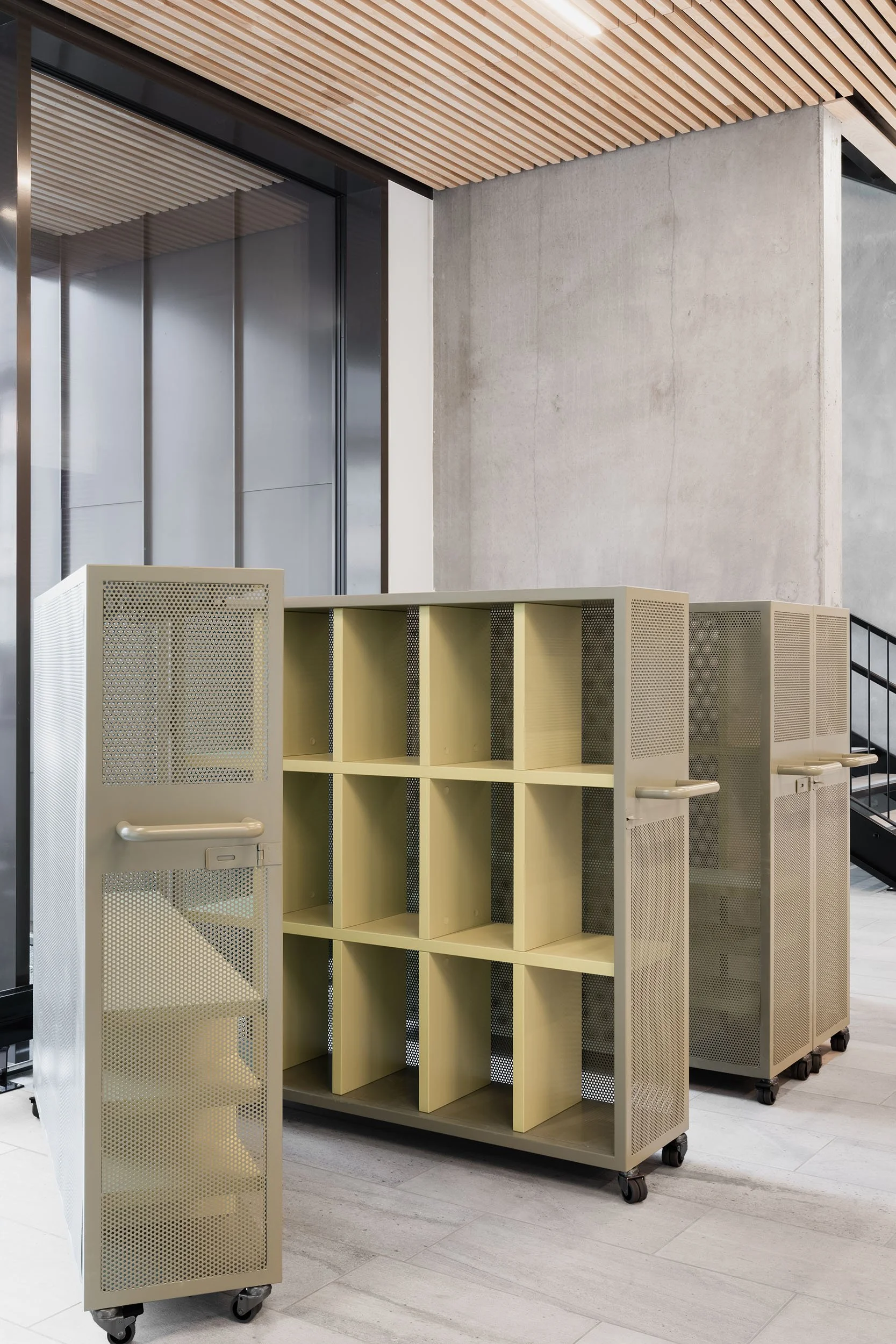 Det ble utviklet spesialdesignede traller for oppbevaring av yttertøy og sekker til klasser som besøker biblioteket. Hvert stativ har kapasitet til sekker, sko og oppheng for opptil 15 barn. Enhetene er utstyrt med låsbare oppbevaringsløsninger og montert på hjul for enkel forflytning.