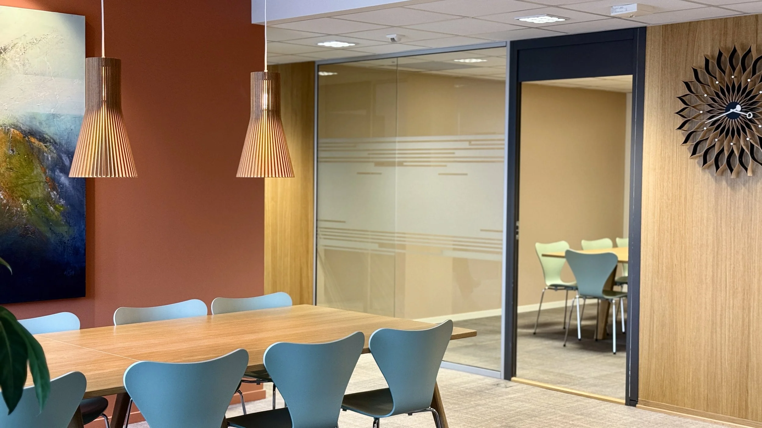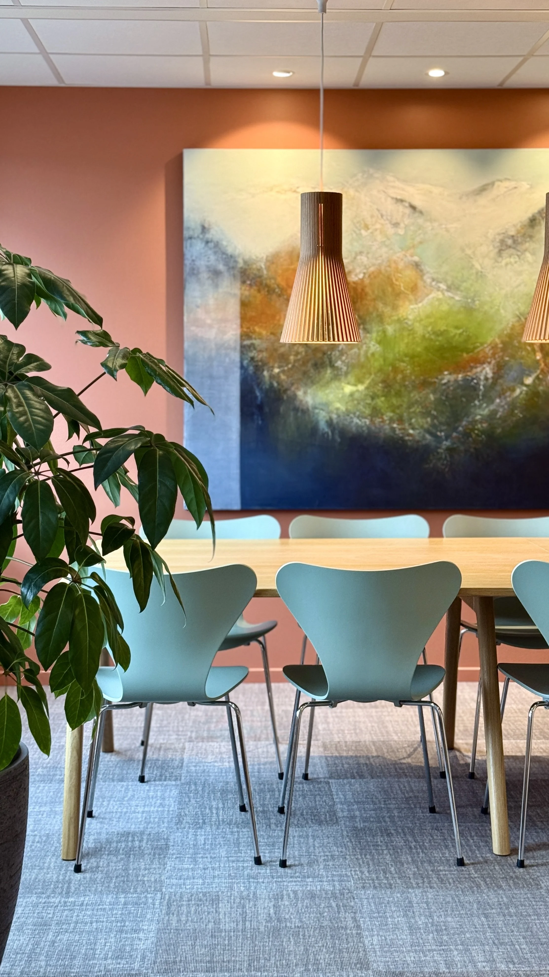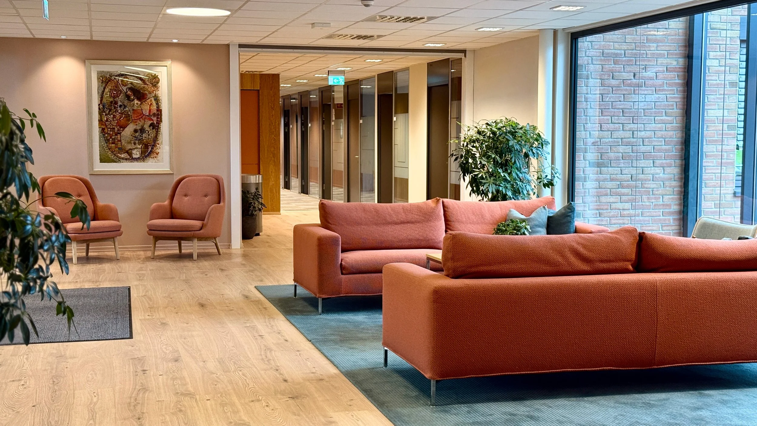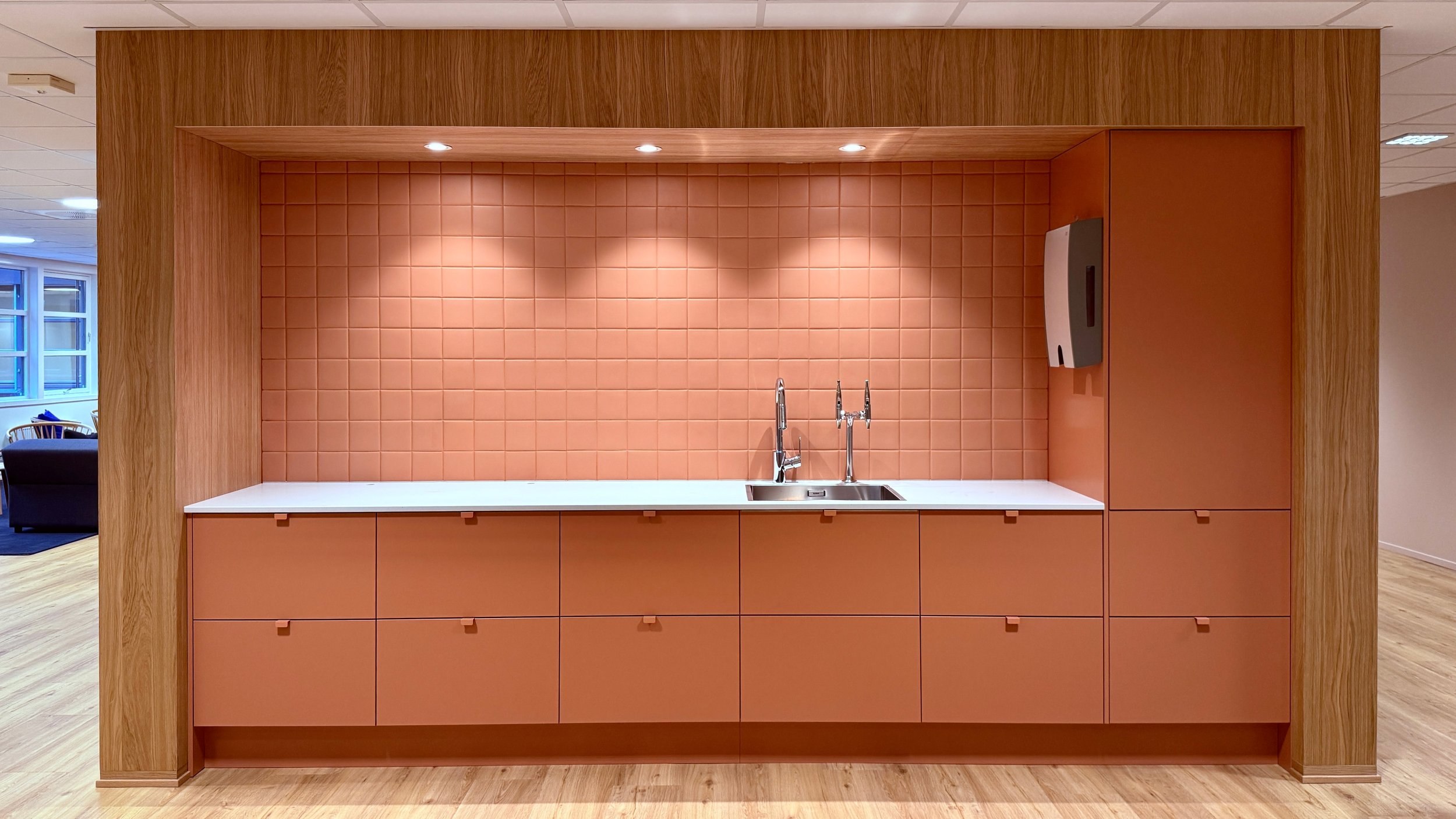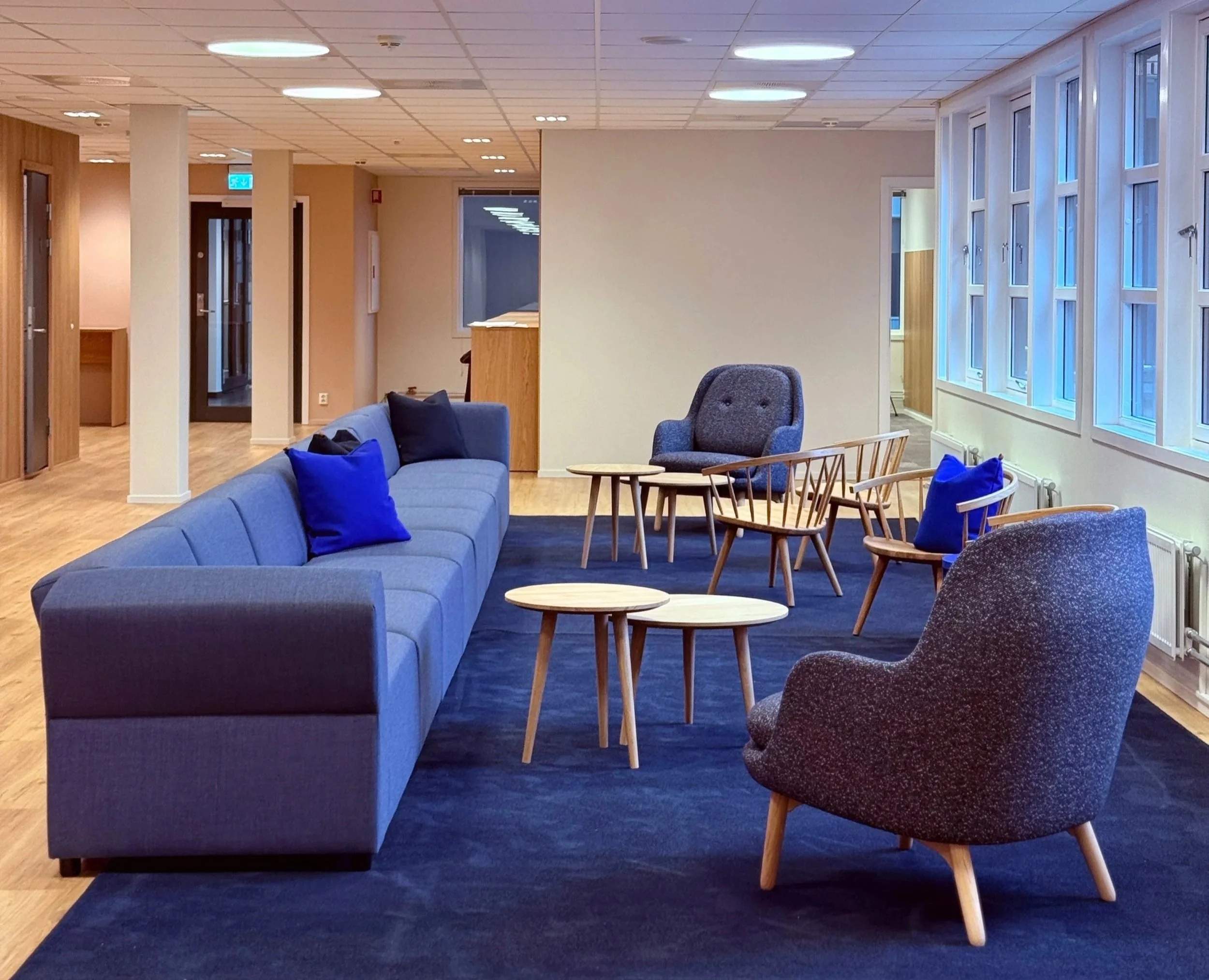 Arbeidsarealene har fått nytt gulvteppe i god kvalitet, og parkett i sosiale soner. Det gir interiørene nytt liv og løfter den estetiske opplevelsen. Kjernen i kontorarealene er kledd i eikefiner med kjøkkenet integrert i endegavlen.