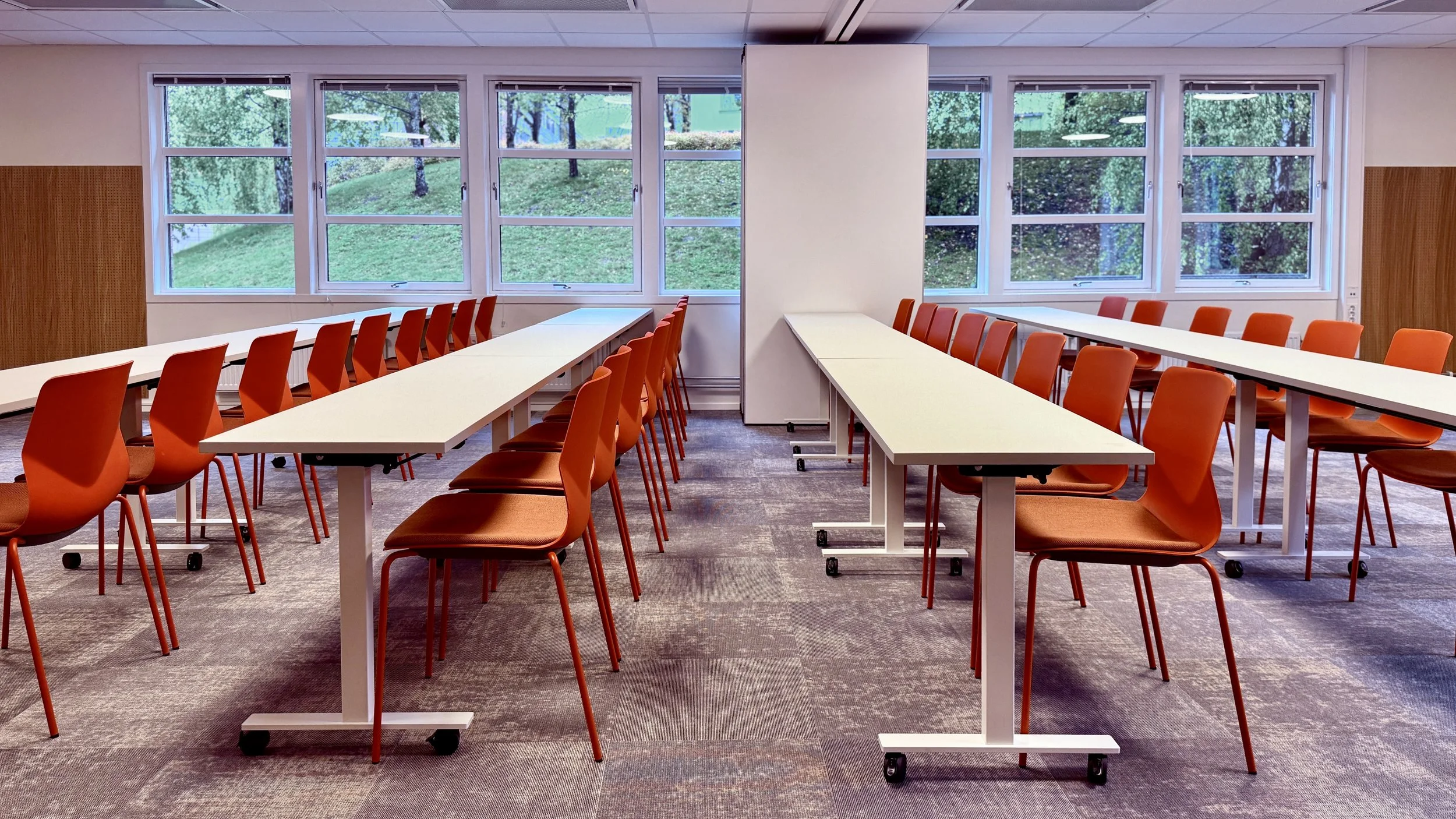 Kursrommene har alle fått dagslys og akustiske veggpaneler i eikefinér. Vrimlearealet har parkettgulv, mens kursrommene har fått nytt gulvteppe i god kvalitet. Det gir bedre akustiske fordeler i tillegg til et mer estetisk uttrykk i tråd med interiørkonseptet.