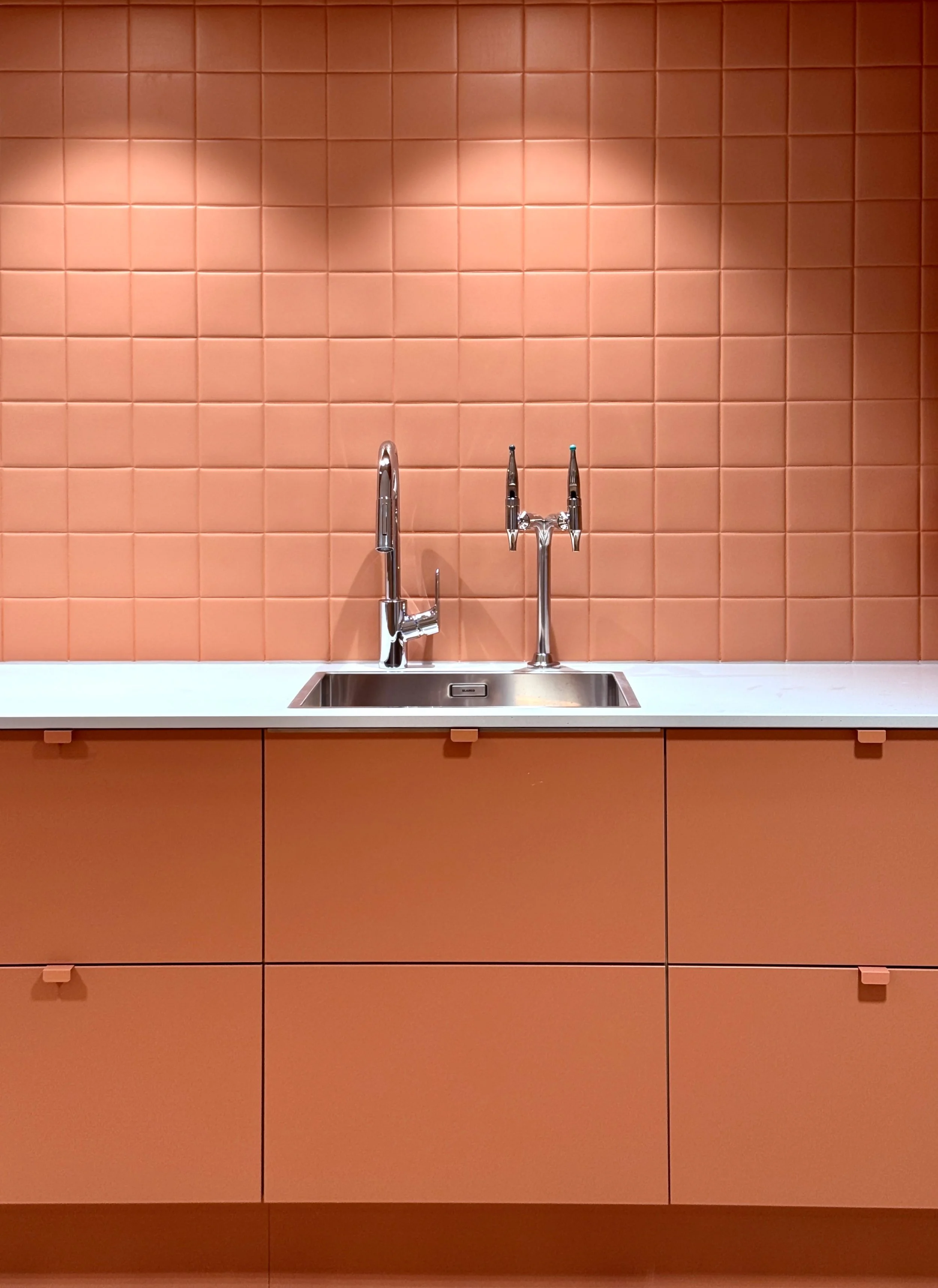 Kjøkkenet er utført i en varmrød tone, med fliser som backsplash i samme farge. Dette gir et rolig og fint uttrykk og underbygger helheten i interiørkonseptet. Møblene består av store deler ombruk og er lakkert på nytt eller omtrukket i tekstiler som er tilpasset etasjefargene. I kurssenteret er også kjerneveggene kledd i eikefiner.