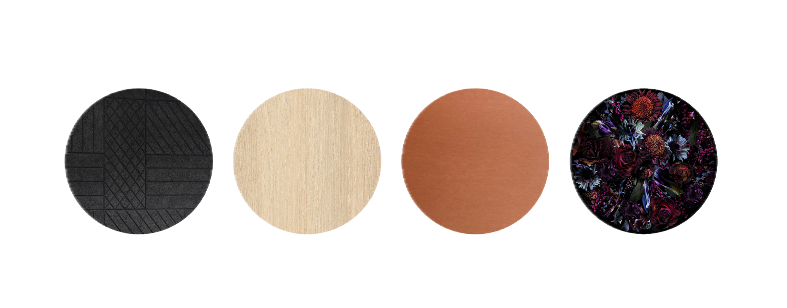 Grunnpaletten har stramme linjer og enkle, men tydelige detaljer i interiøret og den spesialtilpassede innredningen. Sort, eik, varmgrå og hvit danner bakteppet for fargeinnslagene i møbler, lamper og tepper. Arealet er tydelig todelt med et område for besøkende, en egen intern sone med kontorer og sosial sone